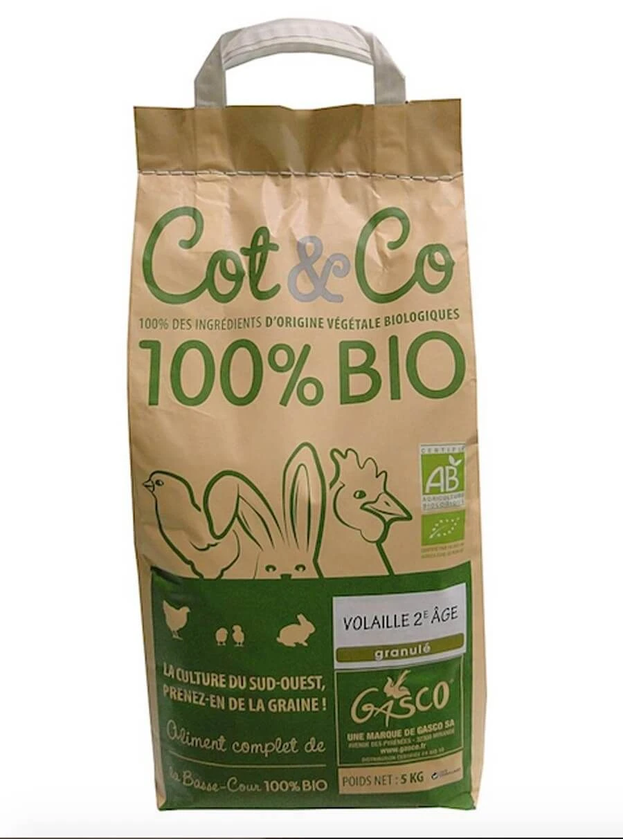 Gasco Cot&Co Bio volaille 2eme âge est une alimentation Bio destiné au volaille de 3-4 semaine d’âge pour une bonne croissance et un bon développement.