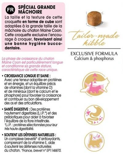 La taille et la texture de cette croquette en forme de cube sont adaptées à la grande taille de la mâchoire du chaton Maine Coon. Cette croquette exclusive l’encourage à croquer, favorisant ainsi une bonne hygiène bucco-dentaire.