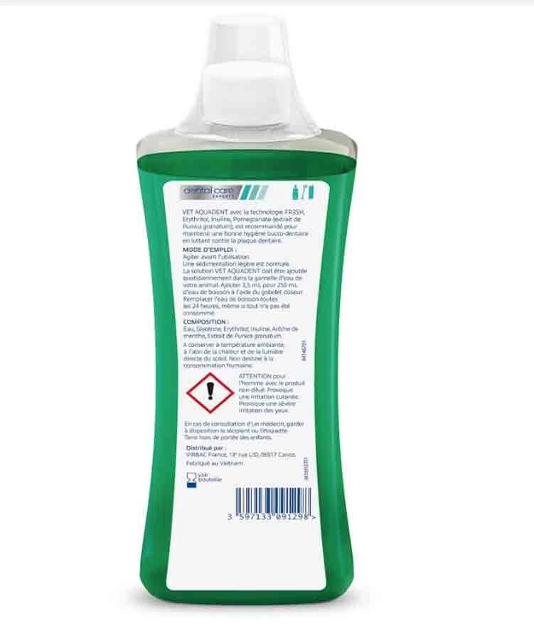 Vet aquadent Fresh est une lotion pour eau de boisson afin de prendre soin de l’hygiène bucco-dentaire de votre chat ou votre chien.